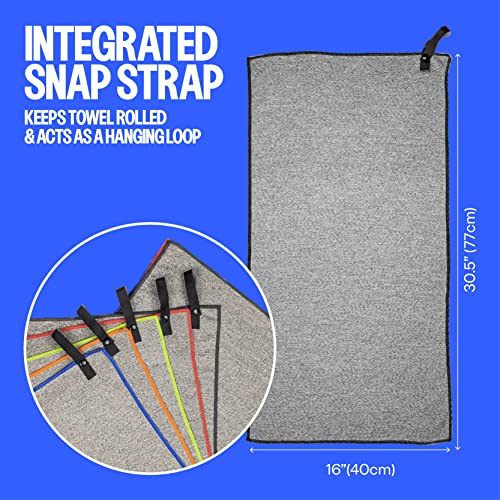 - ULTRA COMPACT, LIGHTWEIGHT, STAY CLEAN WITH HANGING LOOP: With an integrated snap strap closure that doubles as a hanging loop over the door, your backpack, or bottle. the large thin towel rolls up into a packable travel-friendly size. Perfect for anyone who travels light.