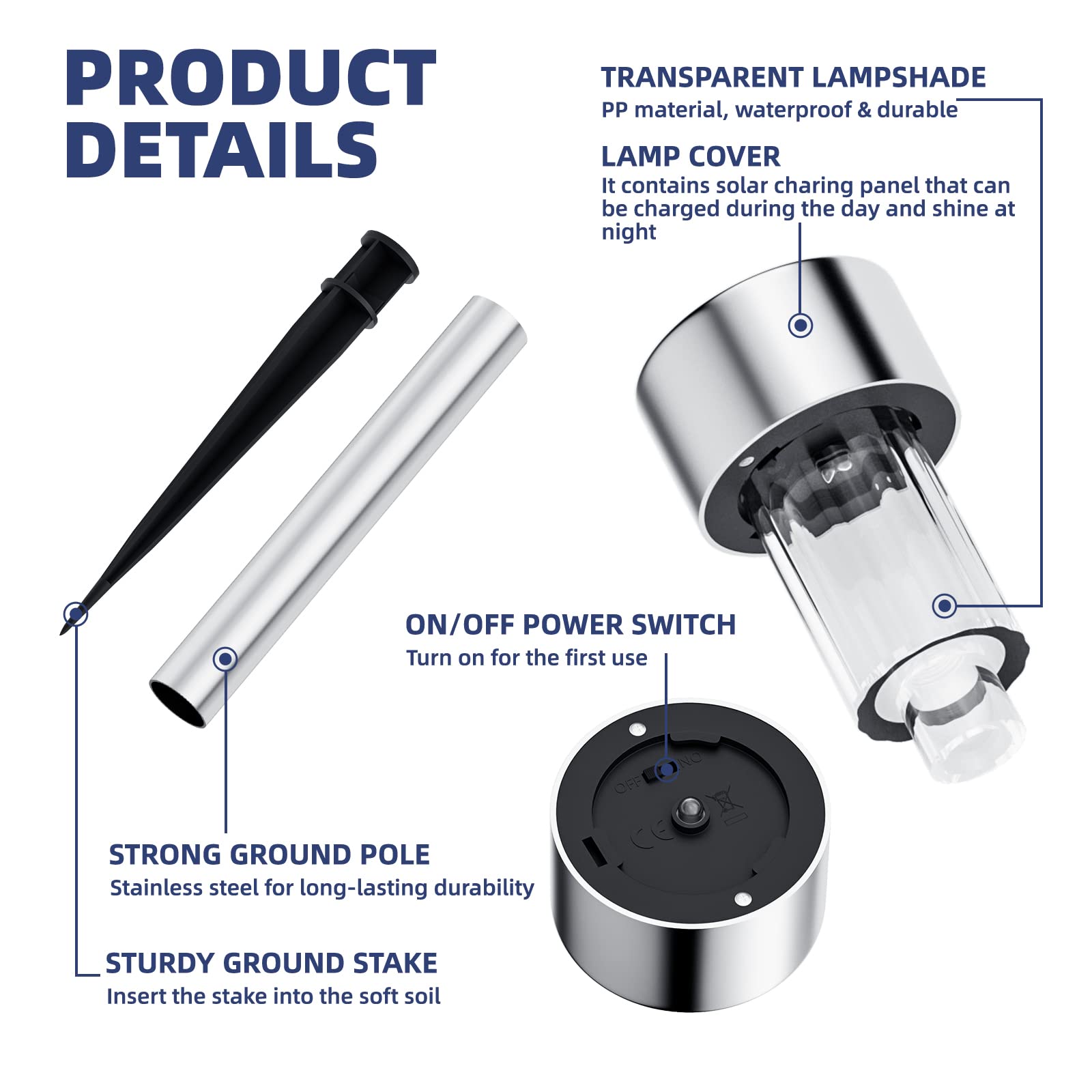 - Easy Installation: No complicated instructions or tools required! Our solar path lights are designed for effortless installation. No need for intricate instructions or tools. Simply flip the switch and securely insert the stake into the soil. Enjoy stable and reliable lighting wherever you desire. These lights provide the perfect combination of simplicity and functionality.